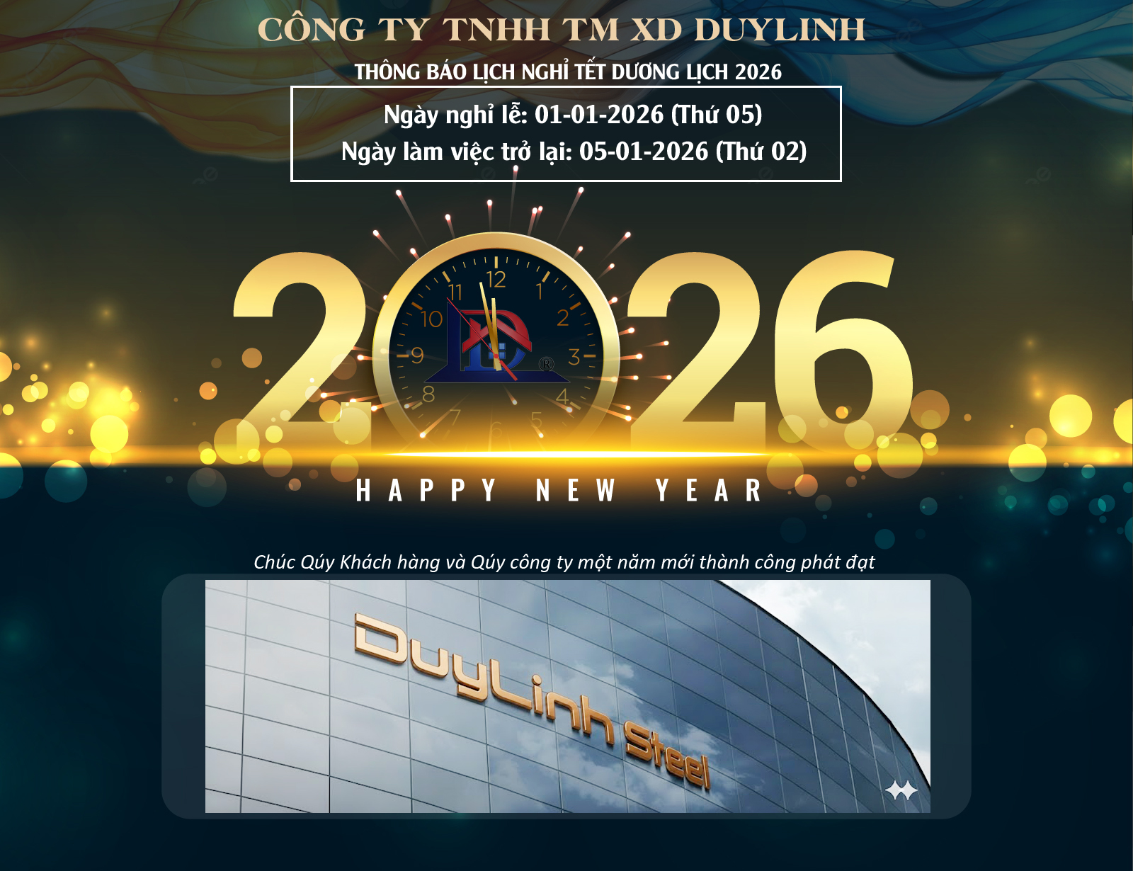 - DuyLinh vẫn xin tiếp nhận đơn hàng như ngày bình thường kể cả ngày lễ chính 01-01-2026. và theo như lịch nghỉ lễ của nhà nước công bố thì DuyLinh xin trả đơn cấp hàng bắt đầu từ ngày 05-01-2026 theo lịch sản xuất hàng hóa từ các nhà máy thép sau nghỉ lễ đã thông báo.
