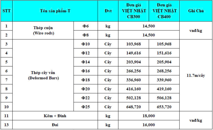 BẢNG GIÁ THÉP KYOEI-VIỆT NHẬT