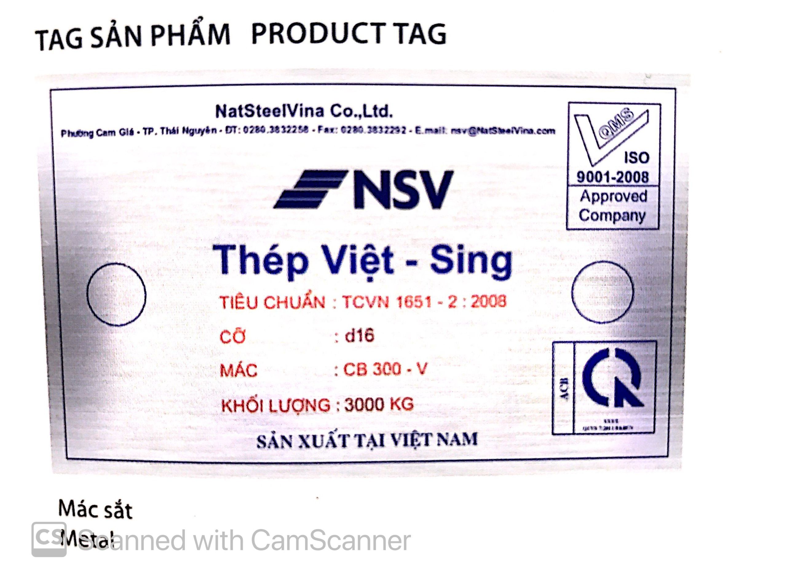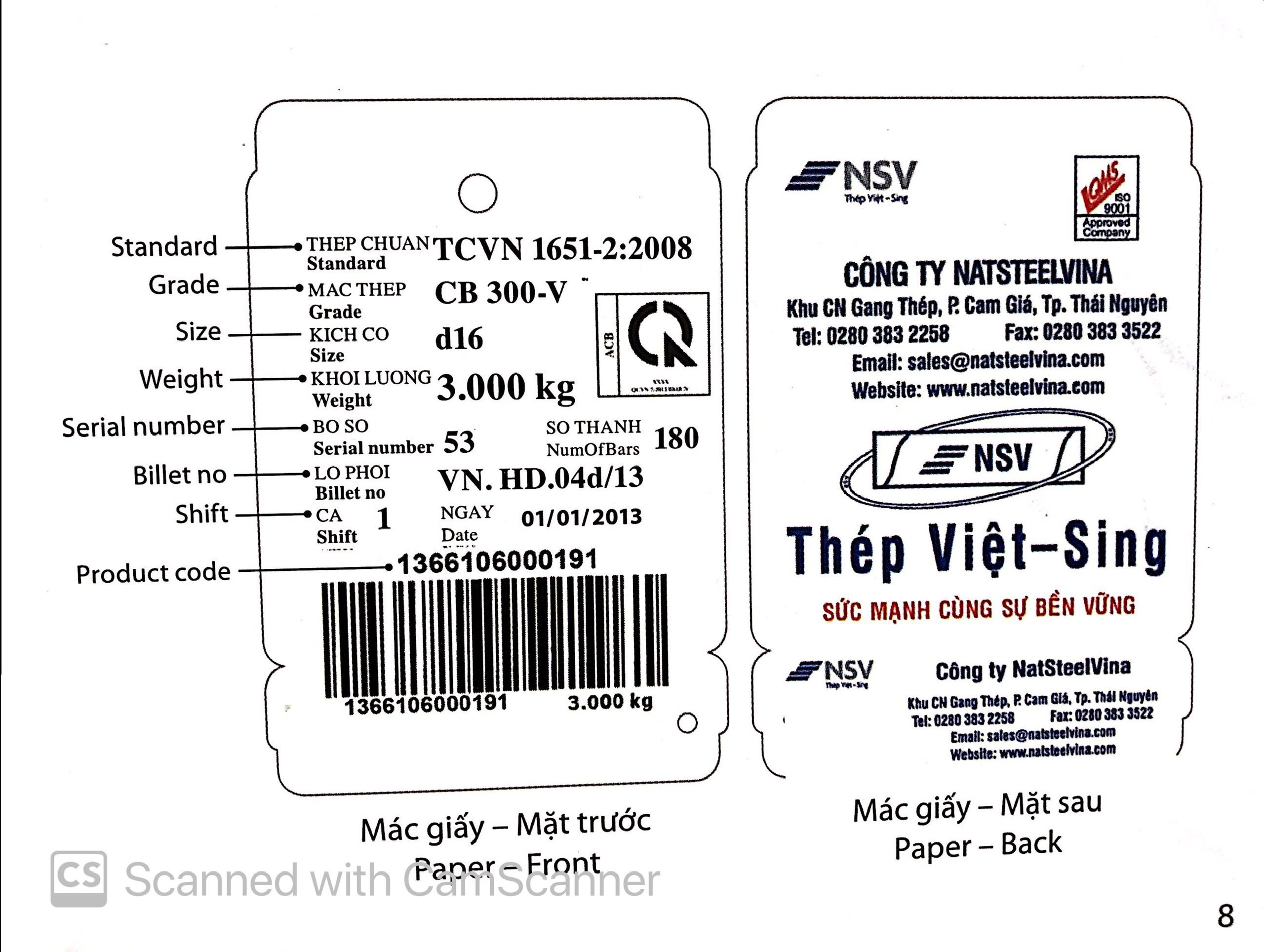 | Bề mặt | Dập nổi các dấu hiệu riêng của thép Việt Sinh: Logo NSV, đường kính, mác thép. |