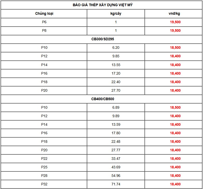 BẢNG GIÁ THÉP VIỆT MỸ (VAS)