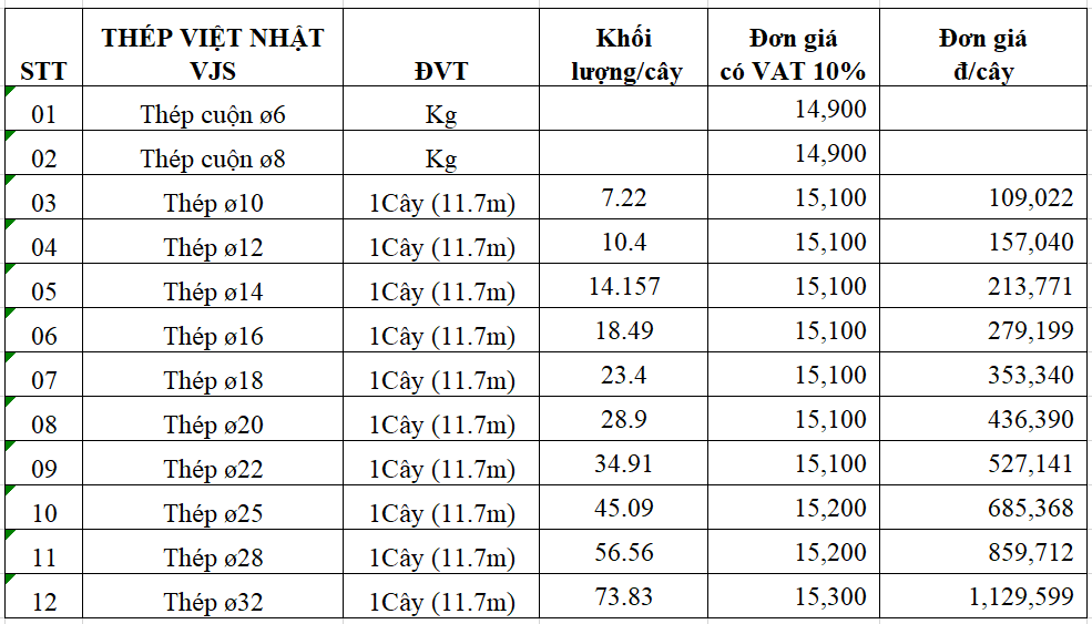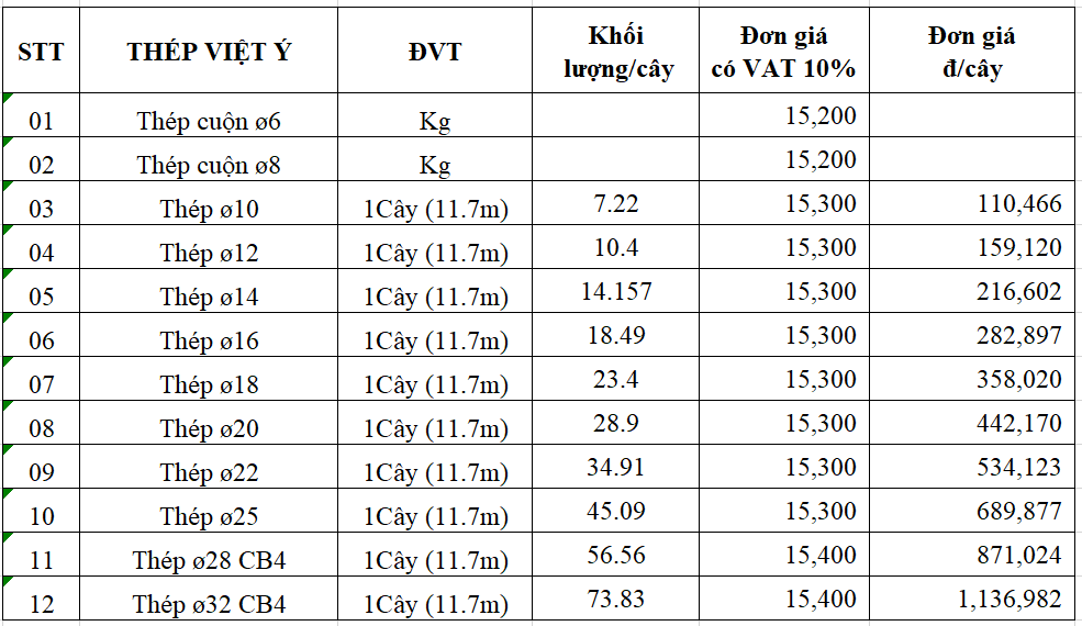 BẢNG BÁO GIÁ THÉP CHỮ U