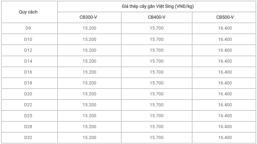 BẢNG GIÁ THÉP VIỆT SING (NSV)